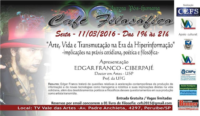 Nos dias 11 e 12 de março de 2016, o Ciberpajé Edgar Franco estará na Baixada Santista realizando atividades a convite do CEFS - Centro de Estudos Filosóficos de Santos. Franco realizará na sexta-feira, dia 11, às 19:00 um Café Filosófico na cidade de Peruíbe, tendo como tema "Arte, Vida e Transmutação na Era da Hiperinformação", com o mesmo tema também será realizado outro Café Filosófico, dessa vez na cidade de Praia Grande, no sábado, dia 12 de março, ás 10h. E ainda no dia 12, em Santos, das 13:00 às 19:00 será ministrado o minicurso "Reflexões filosóficas sobre o pós-humano e seus desdobramentos artísticos". Maiores informações visitem o facebook do CEFS ou na página oficial da instituição.