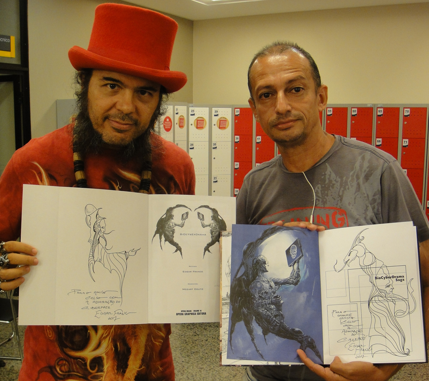 O Ciberpajé e o grande zineiro Celso Moraes, aqui mostrando as artes exclusivas criadas em seus exemplares de BioCyberDrama (Ópera Graphica Editora 2003) e BioCyberDrama Saga (2.ed.).