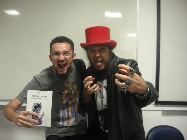 O artista, pesquisador e Dr. Rafael Senra com o Ciberpajé em pose acadêmica durante a sessão de autógrafos nas IV Jornadas Internacionais de quadrinhos na USP. Foto Danielle Barros