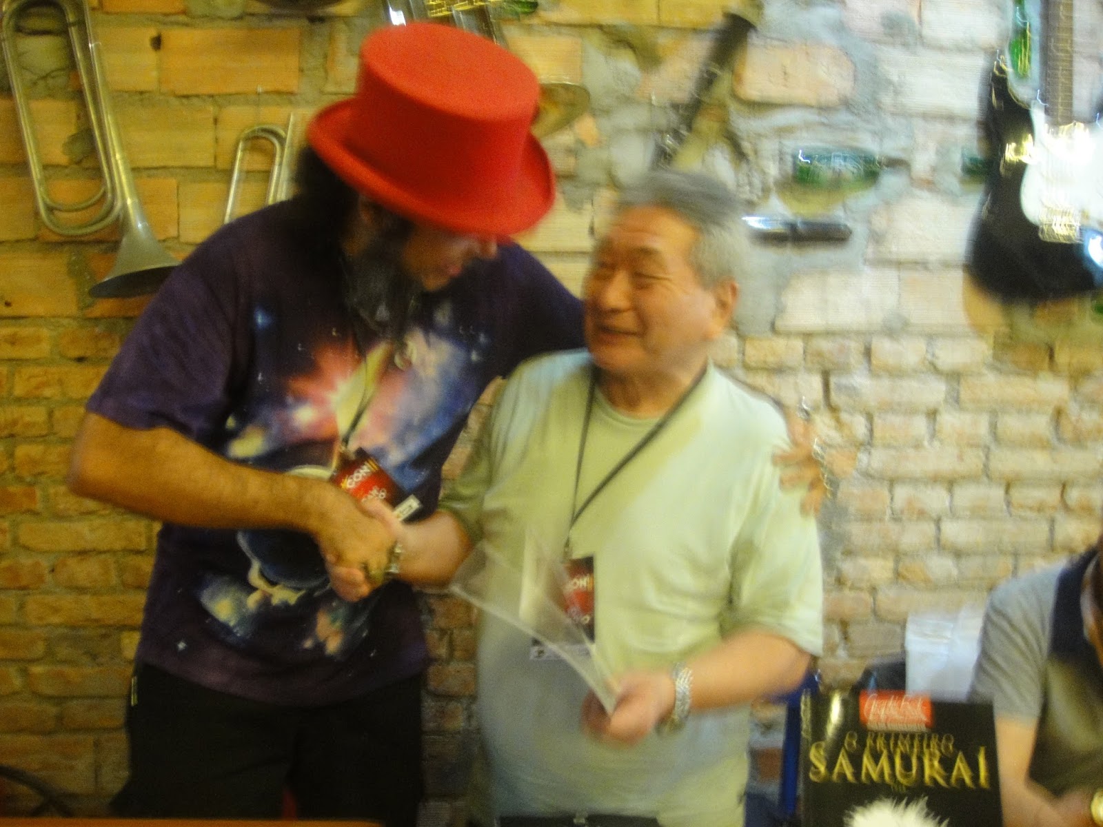Um momento de profunda emoção durante a Sketch Con II, eu ao lado do grande mestre dos quadrinhos Julio Shimamoto, em sua mão seu exemplar de meu novo álbum "Oráculos"! Shima demonstrou toda a sua grandeza de ser, atendendo aos fãs e amigos quadrinhistas de forma sempre afetuosa, serena e entusiasmada. Um verdadeiro Samurai dos quadrinhos que une ao seu extremo talento uma grandeza também imensa como ser humano! Shima esteve na Sketch Con II lançando seu novo álbum "O Primeiro Samurai", que resgata HQs suas de 1958 e as republica com algumas mais recentes. Também estava lançando um belo poster colorido A3 trazendo uma de suas magníficas artes e com o qual fui presenteado pelo mestre. Minha gratidão ao mestre Shima pelas lições de arte e de vida e meus desejos de uma longa e plena vida!