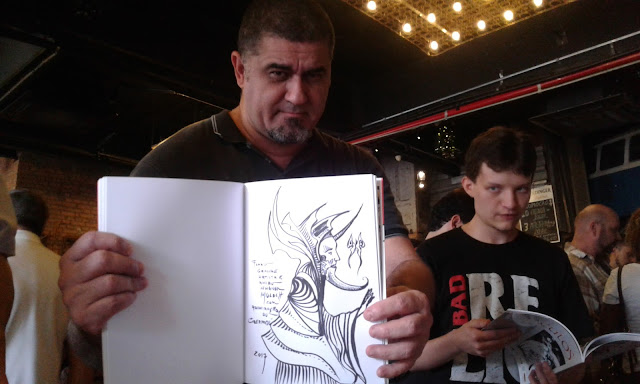 Eu com a grande ativista cultural underground Rosana Raven e seu namorado. Rosana é uma amiga de longa data e tem promovido com afinco, ao longo dos anos, inúmeros veículos de divulgação da cultura obscura e darkwave brasileira, uma dessas publicações é o incrível zine "Flores do Lado de Cima", do qual tive a chance de participar algumas vezes falando de minha arte visual e divulgando minha banda Posthuman Tantra. Rosana foi à SketchCon II prestigiar o meu trabalho e saiu de lá com um exemplar especialmente autografado de meu álbum SketchBook Edgar Franco. Minha gratidão ETERNA a você, amiga Rosana, pelo seu apoio e amizade durante esses anos e meus parabéns pelo incrível trabalho que realiza em prol da arte underground!