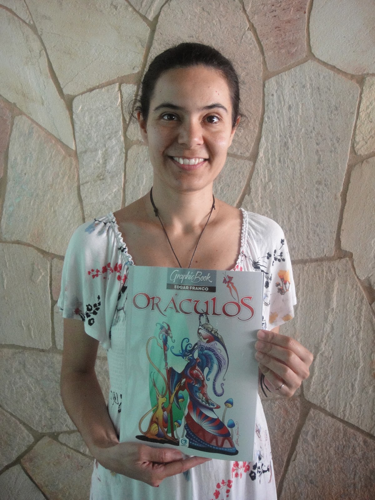 Ariadne Franco, irmã do Ciberpajé com seu exemplar de "Oráculos" em mãos